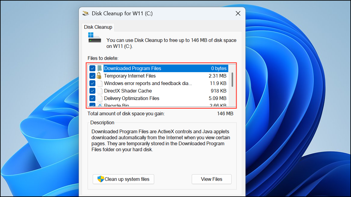 Step 2: Choose the drive where Windows is installed, typically C:, and select file categories to delete, such as temporary files, system cache, and previous update files.