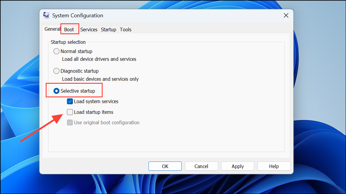 Step 2: On the General tab, select Selective startup and uncheck Load startup items.