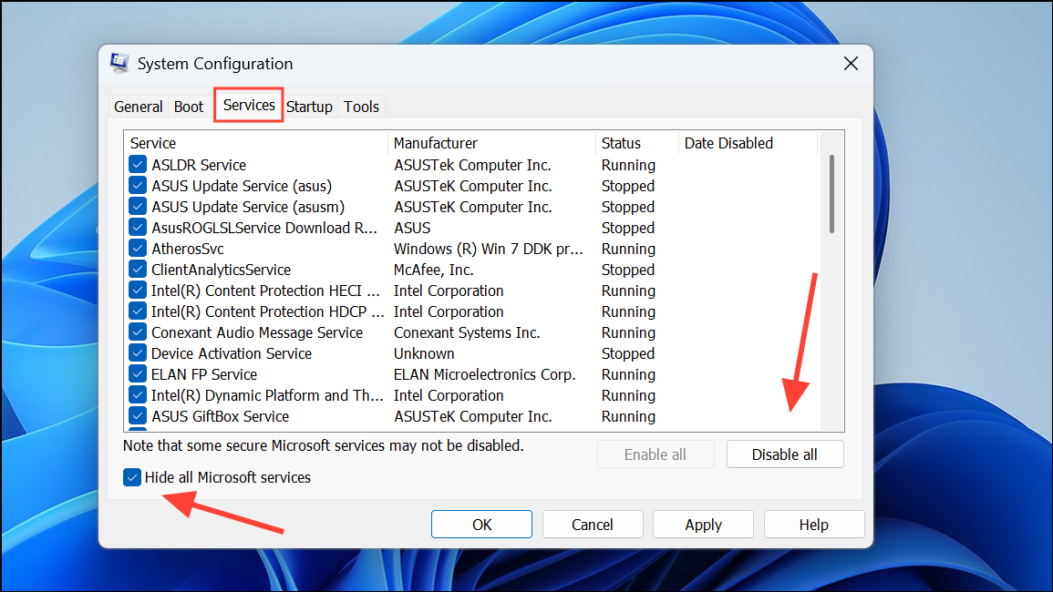 Step 3: Go to the Services tab, check Hide all Microsoft services, then click Disable all to turn off non-Microsoft services.