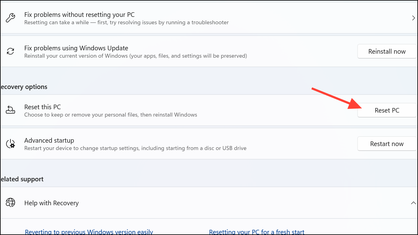 Step 2: Under Reset this PC, click Reset PC and choose either Keep my files or Remove everything depending on your needs. Follow the prompts to complete the reset process.