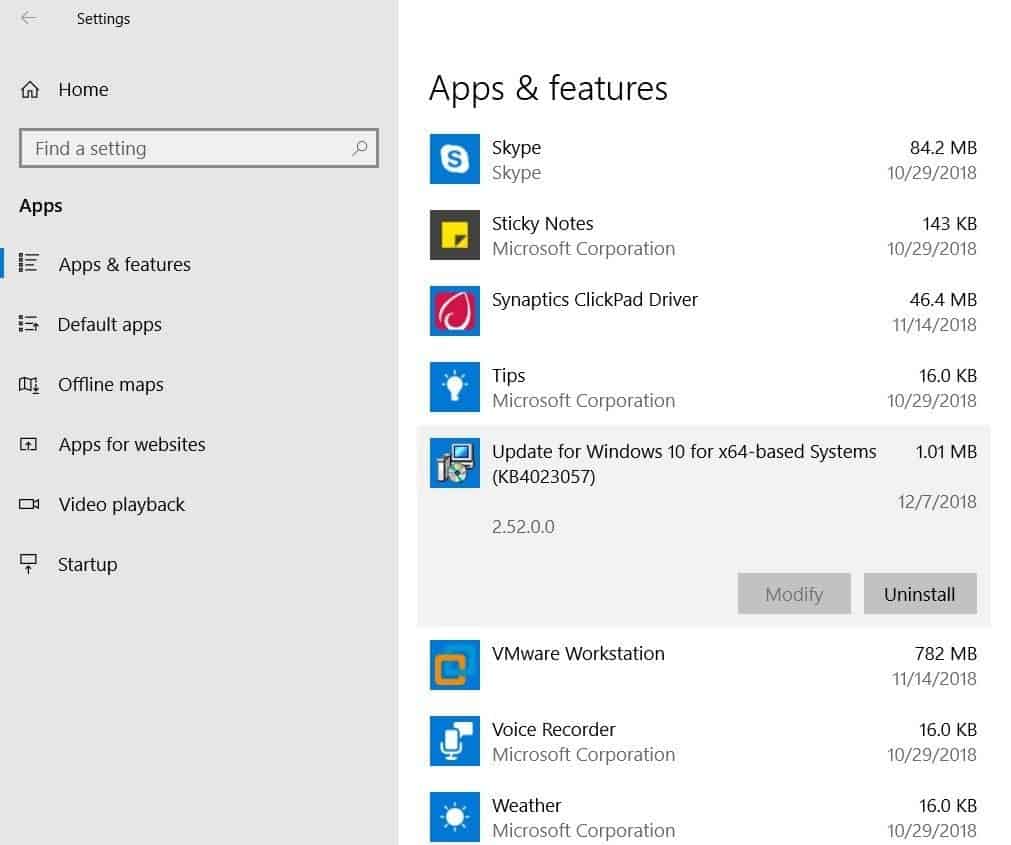 Chances are you already have the previous KB4023057 update installed on your system and hence your system isn’t accepting the newer version of the update. To fix this problem, uninstall the previous release from Windows 10 Apps & Features setting: