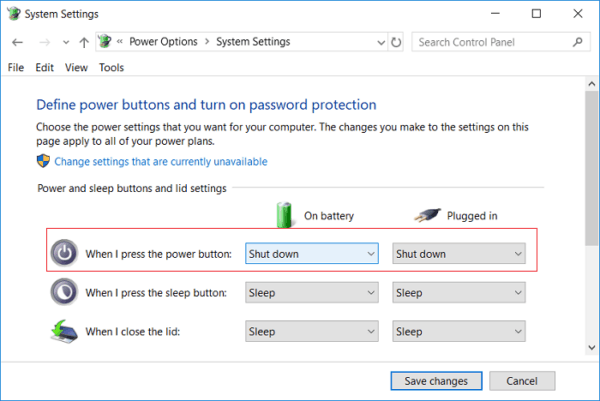 - Select the When I press the power button option and set both the drop-downs to Shut down.