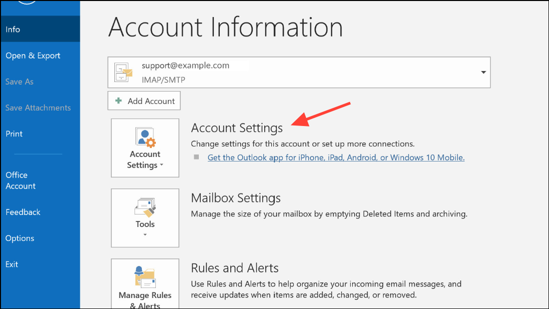 Step 1: Open Outlook and select the File tab at the top left. Click Account Settings and choose Account Settings again from the dropdown.