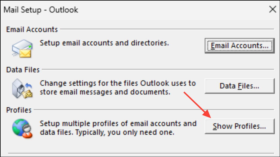 Step 1: Open the Windows Control Panel and select Mail (Microsoft Outlook). In the Mail Setup dialog, click Show Profiles.