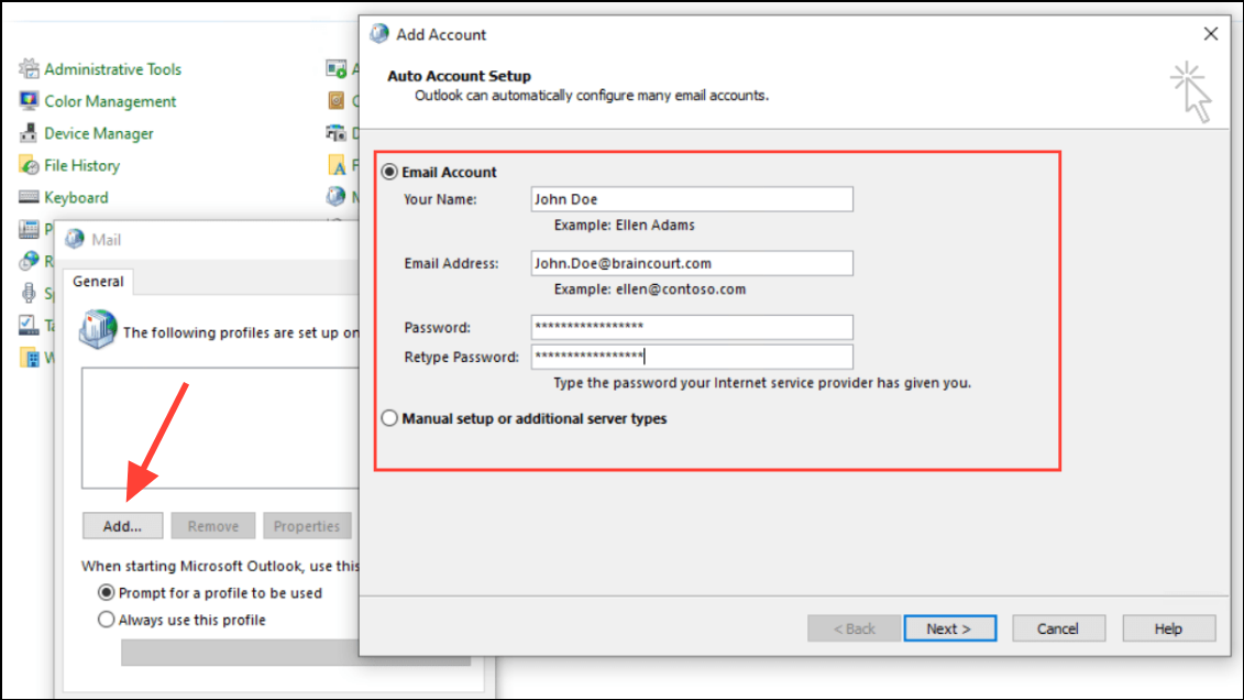 Step 2: Click Add to create a new profile. Enter a name for the profile and follow prompts to set up your email account from scratch, using the correct server settings and ports as provided by your email service.