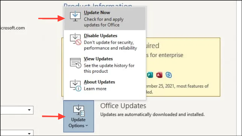 Step 1: In Outlook, go to File > Office Account > Update Options and select Update Now. Install any available updates for Microsoft Office.