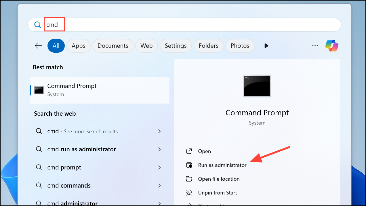 Step 1: Open Command Prompt with administrator privileges. Press Win + S, type cmd, right-click on Command Prompt, and select Run as administrator.