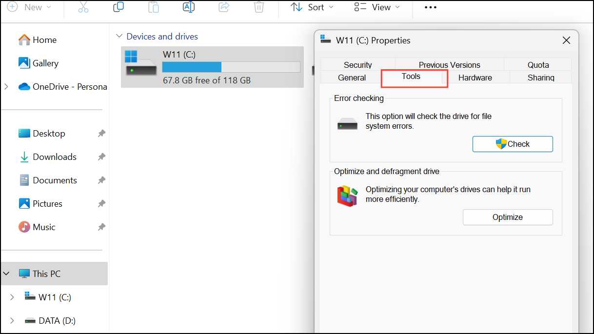 Step 2: Right-click your system drive (usually C:), select Properties, and go to the Tools tab.