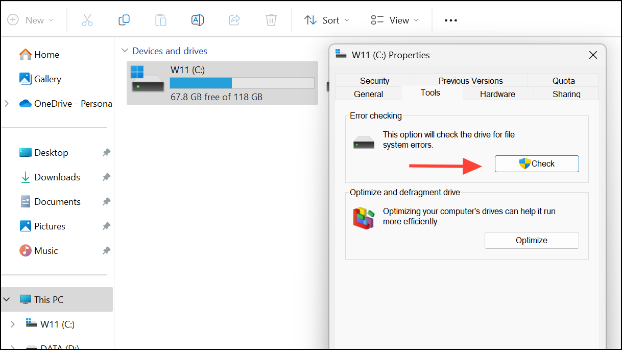 Step 3: Under Error checking, click Check. If errors are detected, follow the prompts to repair them. This process may require a restart to complete repairs on the system drive.