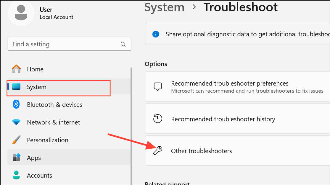 Step 2: Navigate to System > Troubleshoot > Other troubleshooters (on Windows 11) or Update & Security > Troubleshoot > Additional troubleshooters (on Windows 10).