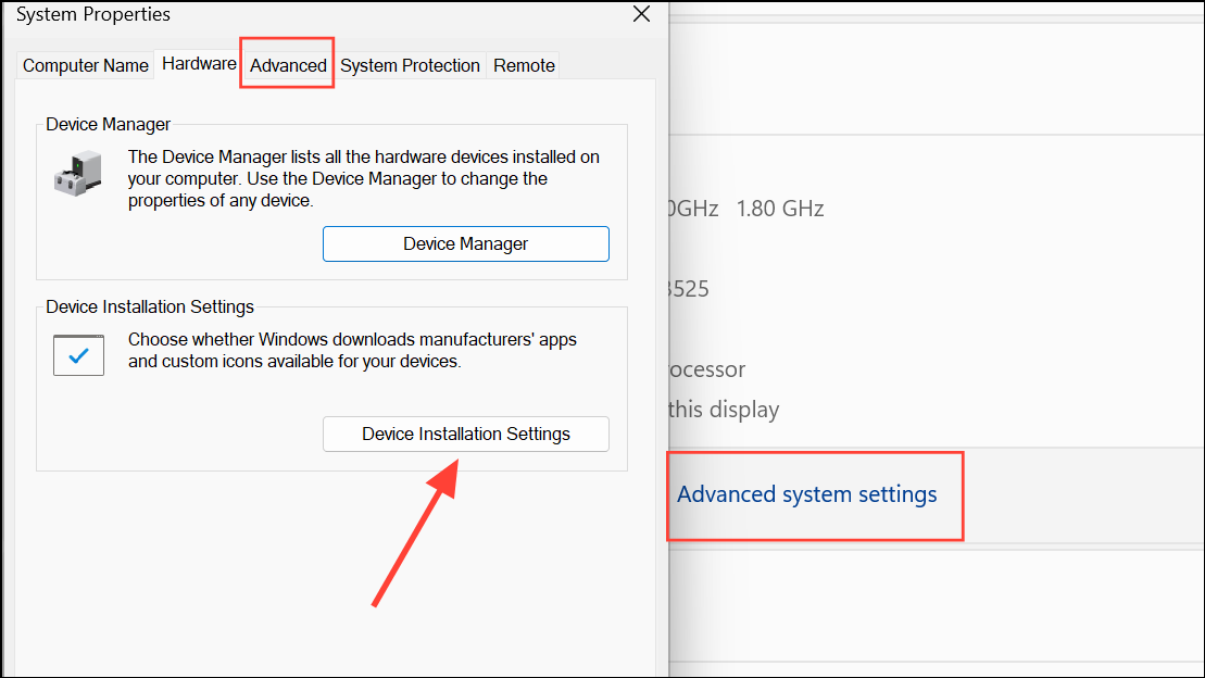 Step 2: Click Advanced system settings on the left, then open the Hardware tab and select Device Installation Settings.