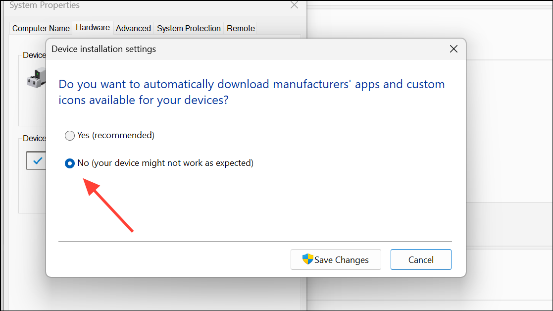 Step 3: Choose No (your device might not work as expected) and click Save Changes. Restart your PC to apply the settings. You can now manually download and install drivers from your hardware manufacturer's website if needed.