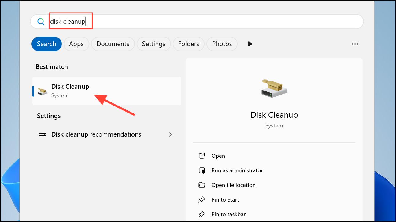 Step 1: Press Win + S, type Disk Cleanup, and select the tool.