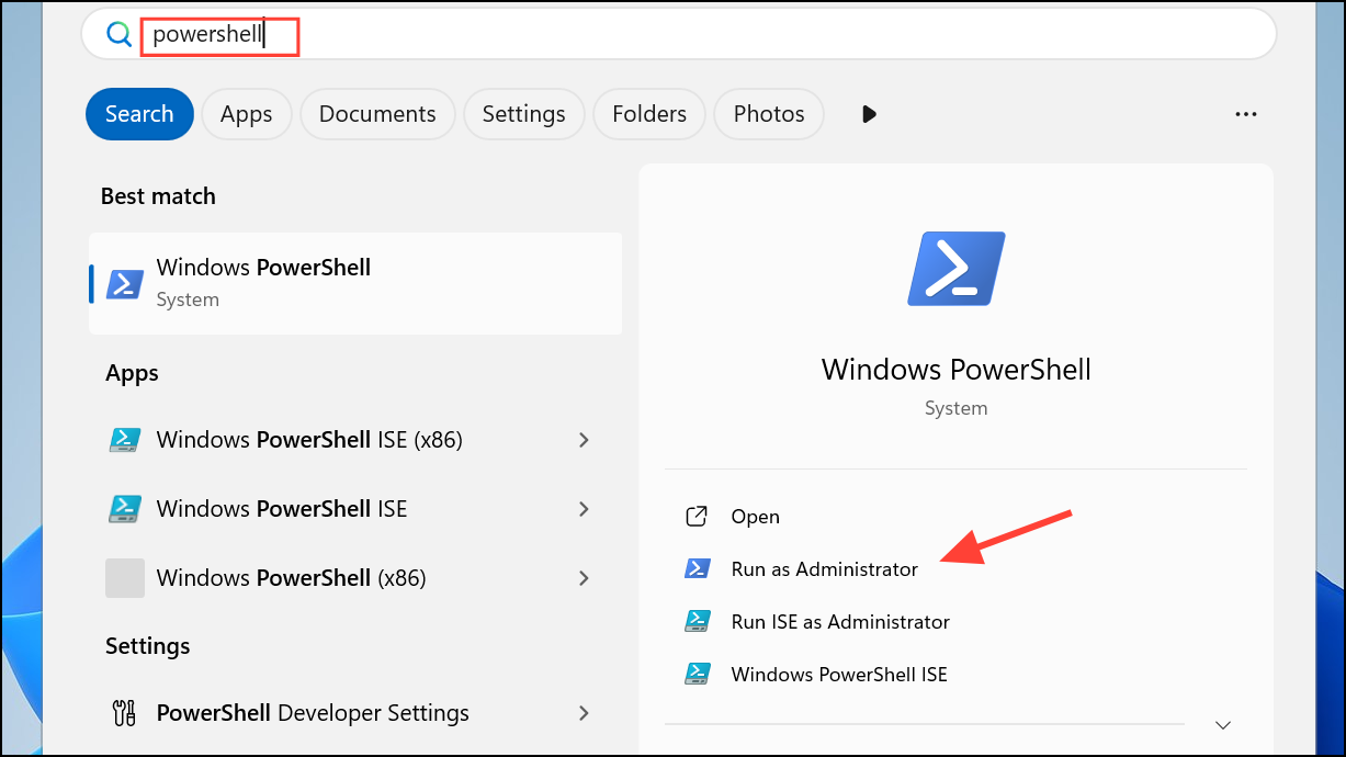 Step 3: Open Windows PowerShell as Administrator. You can do this by searching for "PowerShell" in the Start menu, right-clicking the result, and choosing "Run as administrator."