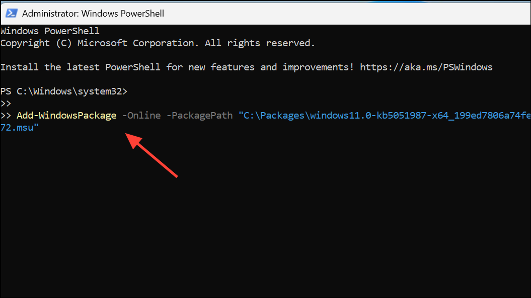 Add-WindowsPackage -Online -PackagePath "C:\Packages\windows11.0-kb5051987-x64_199ed7806a74fe78e3b0ef4f2073760000f71972.msu"