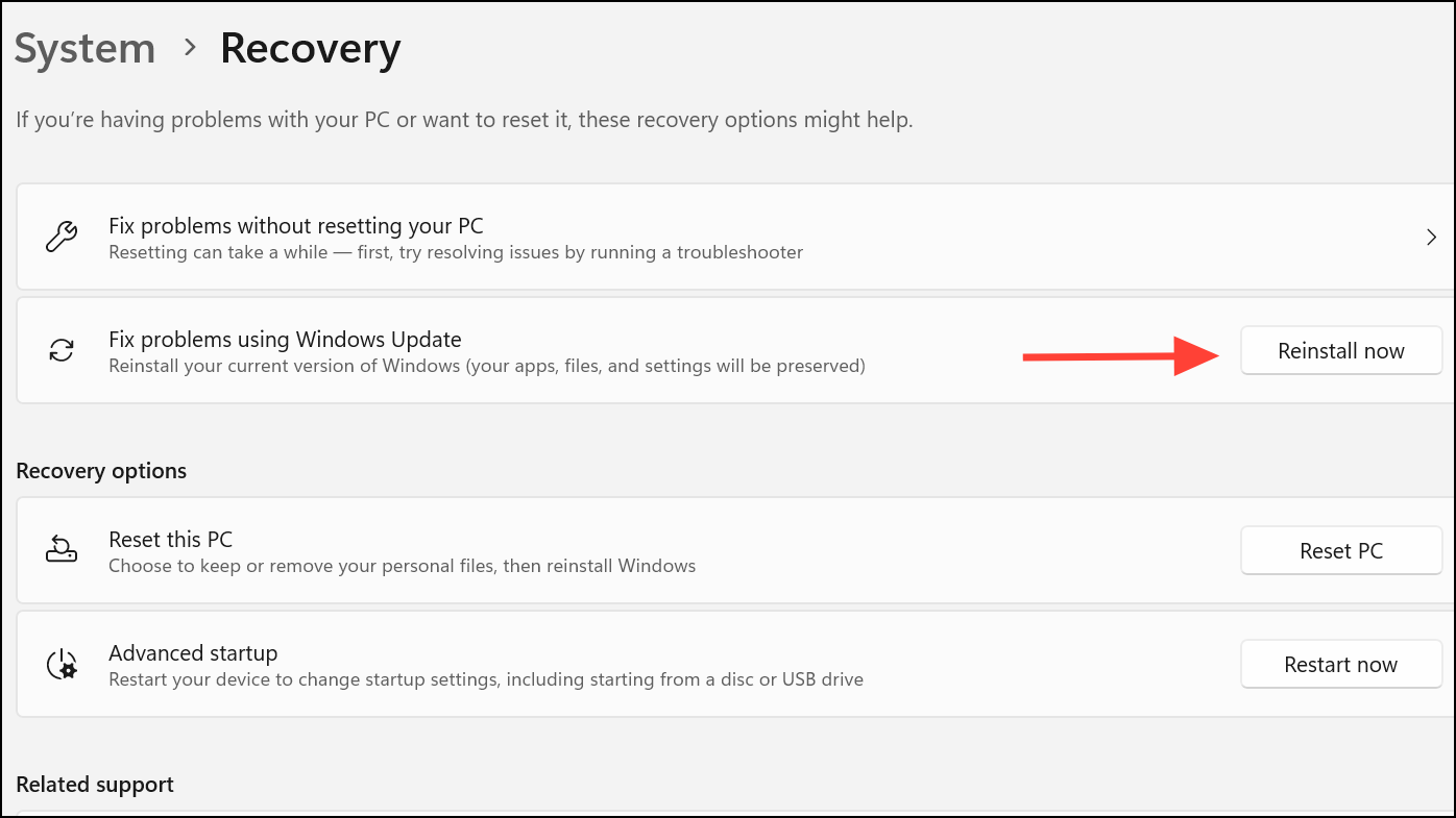 Step 2: Under "Fix problems using Windows Update," select Reinstall now. Follow the prompts to start the repair installation.