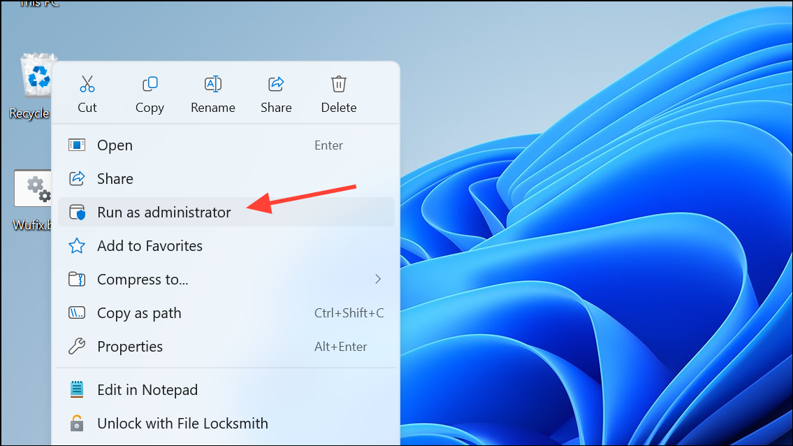 Step 2: Save the file as Wufix.bat on your Desktop. Right-click the file and select Run as administrator. Confirm any prompts. This script stops and restarts update services, clears cached update data, and repairs system files.