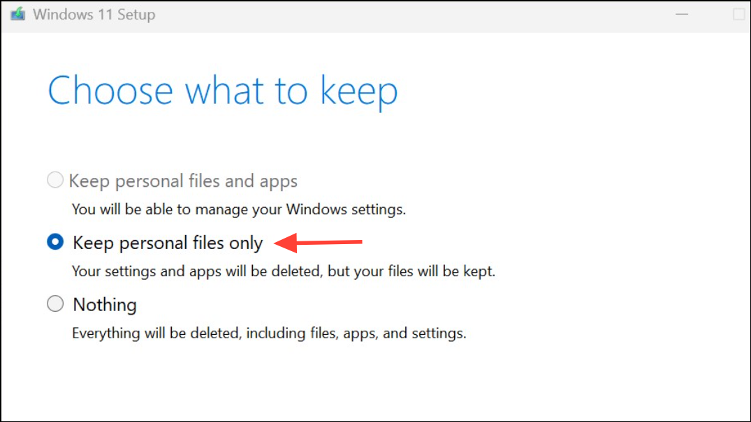 Step 4: When prompted, choose Keep personal files only. This option preserves your documents and data but removes installed apps and resets system settings, which can resolve deep-seated update errors caused by corrupt applications or system files. If you select Keep personal files and apps, the issue may persist, so opt for files only.