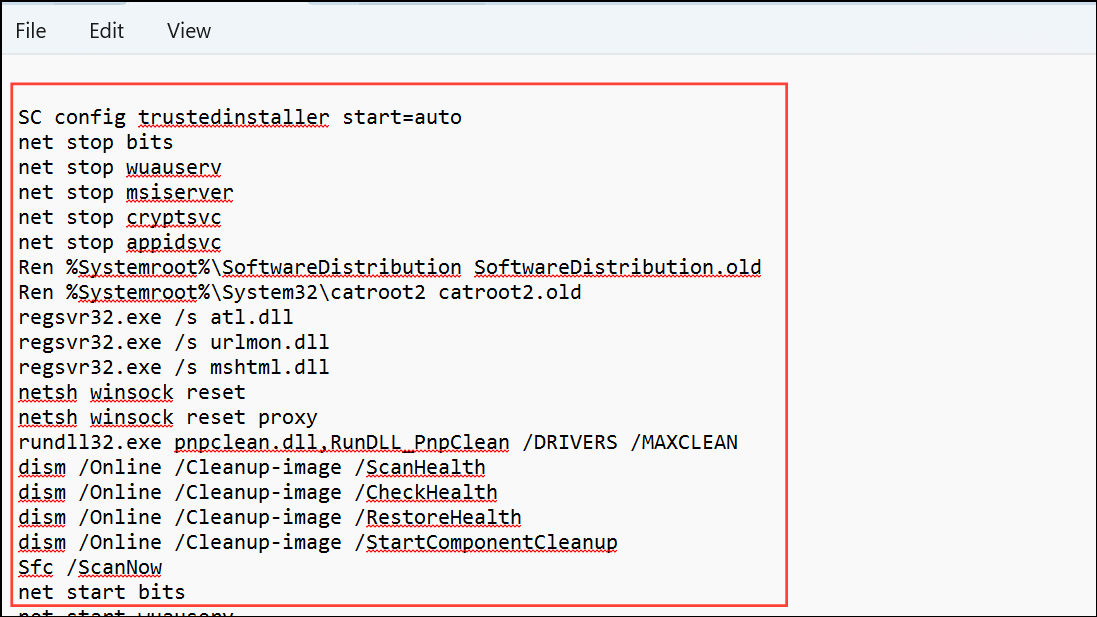 Step 1: Open Notepad and copy the following batch script, which systematically stops update-related services, renames key folders, re-registers system files, and restarts services:
