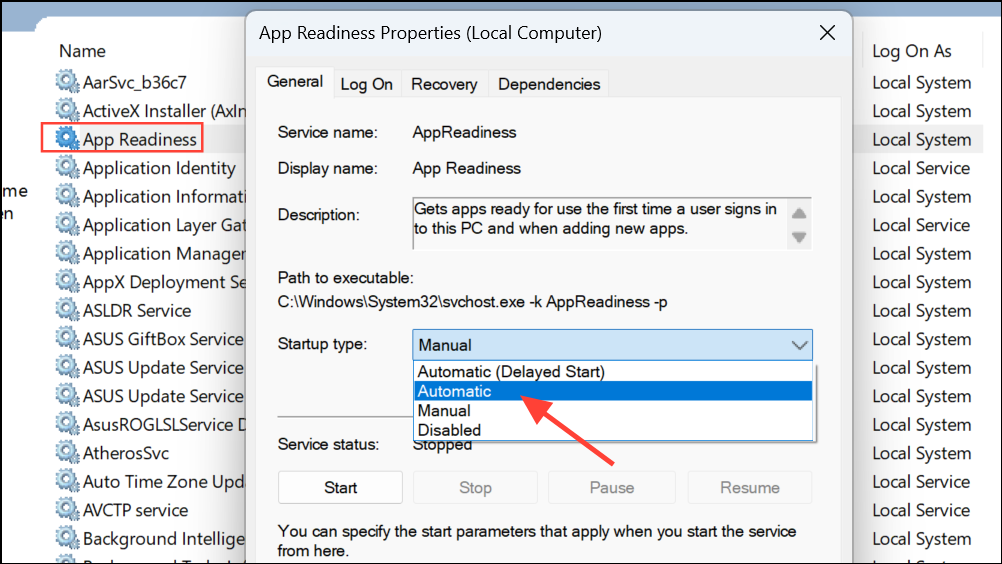 Step 2: Locate App Readiness in the list. Double-click it, set Startup type to Automatic, apply changes, and click Start if the button is available.