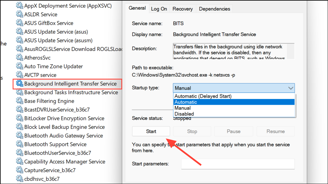 Step 3: Repeat for Windows Update and Background Intelligent Transfer Service (BITS). Both should be set to Automatic. If either is stopped, click Start. Right-click and select Restart for both services to ensure they are running smoothly.