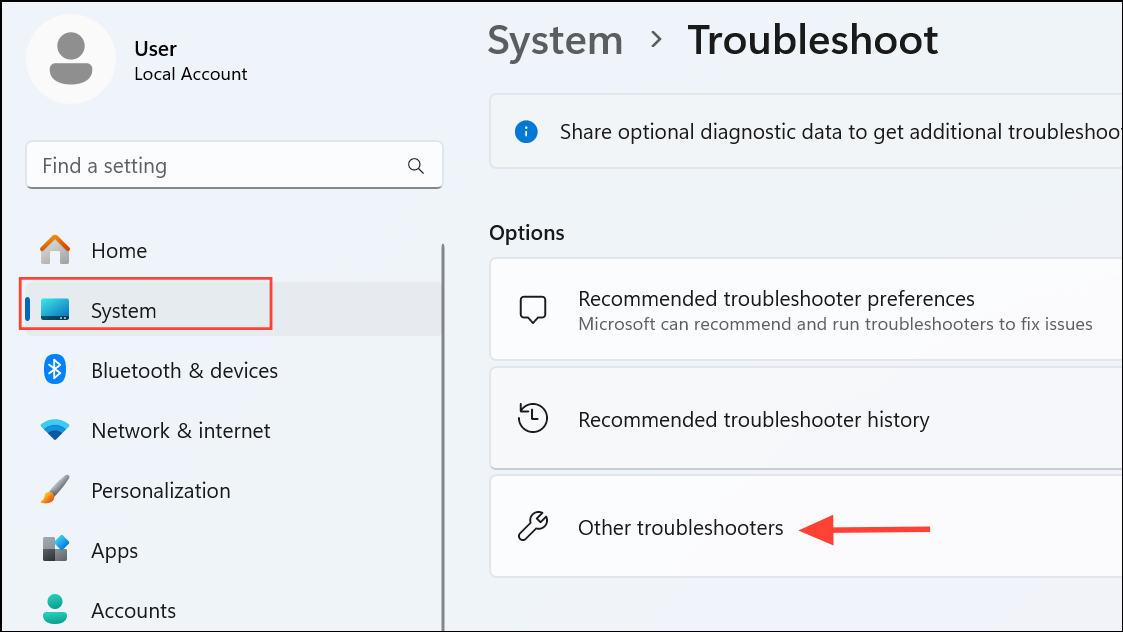 Step 1: Open Settings using Windows + I, then go to System > Troubleshoot > Other troubleshooters.
