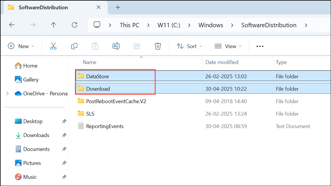 Step 3: Open File Explorer and navigate to C:\Windows\SoftwareDistribution. Delete all files and folders inside both the DataStore and Download subfolders. This process removes corrupted cache files that may be blocking updates.