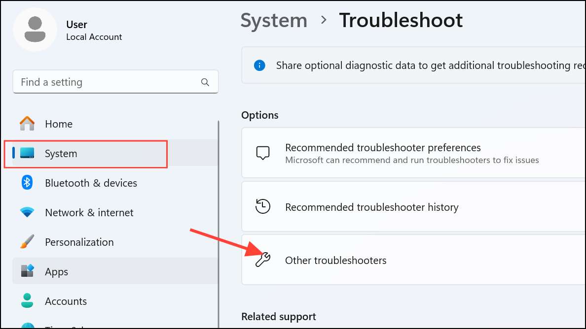 Step 1: Press Windows + I to open Settings. Navigate to System > Troubleshoot > Other troubleshooters.