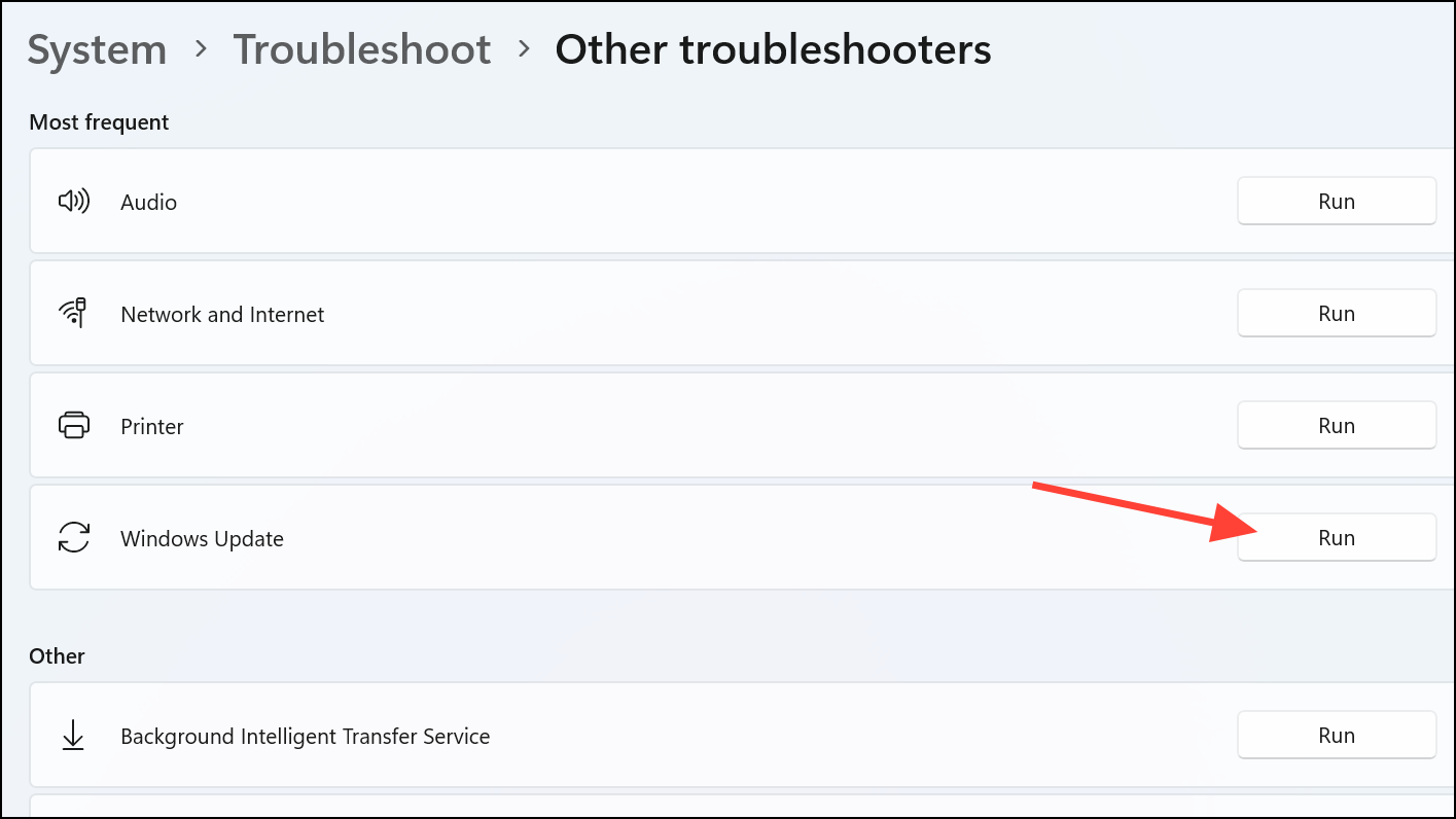 Step 2: Locate Windows Update in the list and click Run next to it. The tool will scan for update issues and apply recommended fixes automatically.
