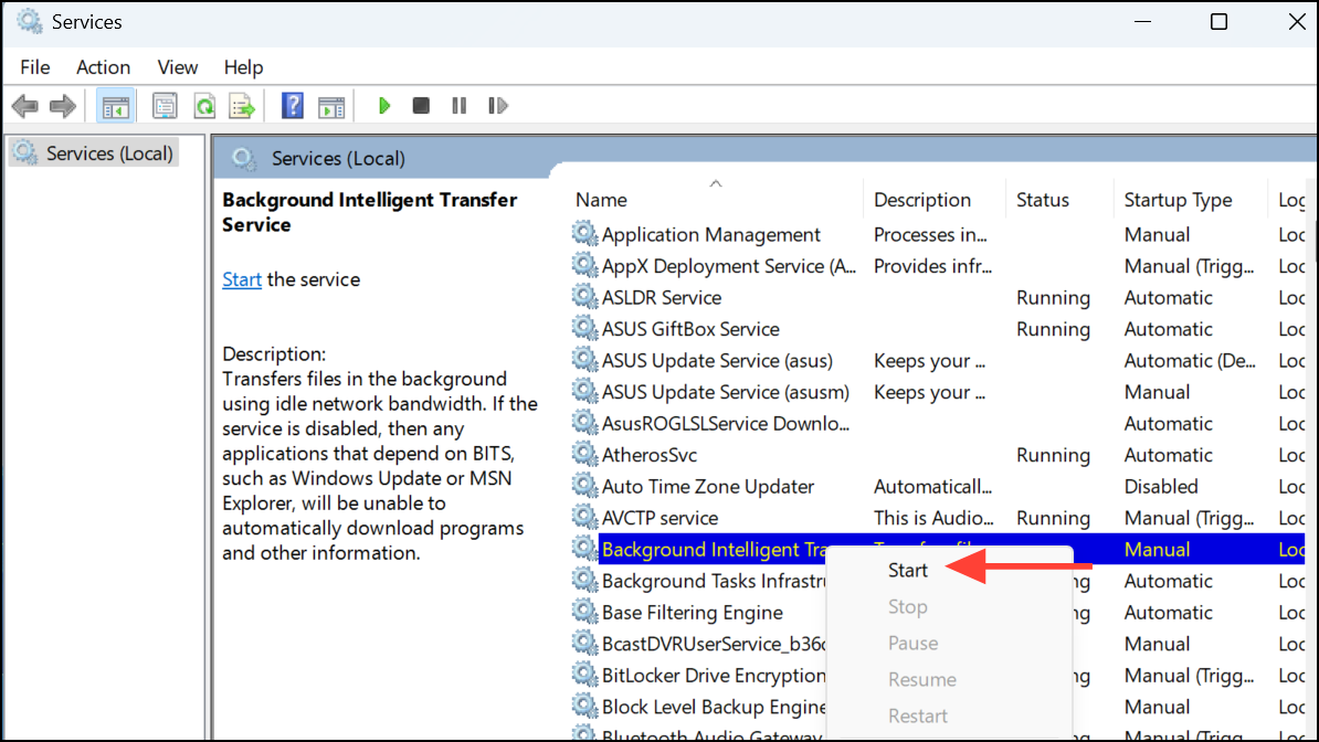 Step 2: Locate Windows Update, Background Intelligent Transfer Service, and Cryptographic Services. Right-click each one and select Start or Restart if they are not running.