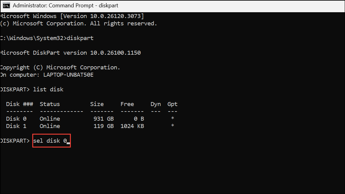 Step 4: Select the target disk by typing sel disk 0 (replace 0 if your target disk has a different number) and press Enter.