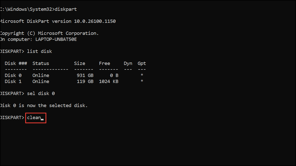 Step 5: Type clean and press Enter. This command removes all partitions and data from the selected disk, returning it to unallocated space.