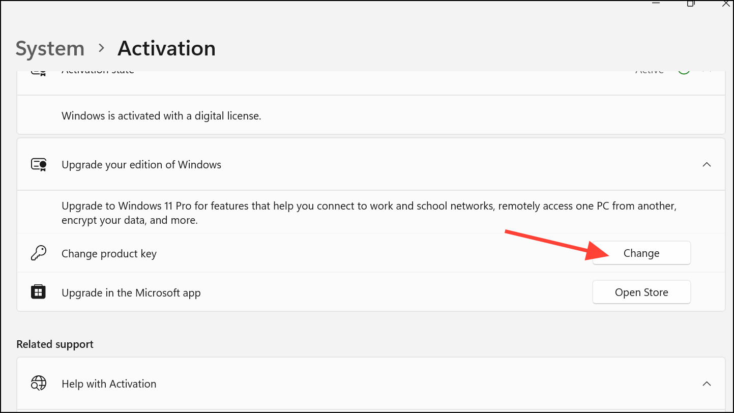 Step 2: If you have a Retail license or a product key, enter it manually. In the Activation settings, expand the Upgrade your edition of Windows section, click Change product key, and enter your valid 25-character key. This step is necessary if the digital license cannot be validated automatically.