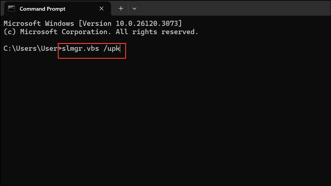 This command uninstalls the product key from the current installation, freeing it for use on your new device.