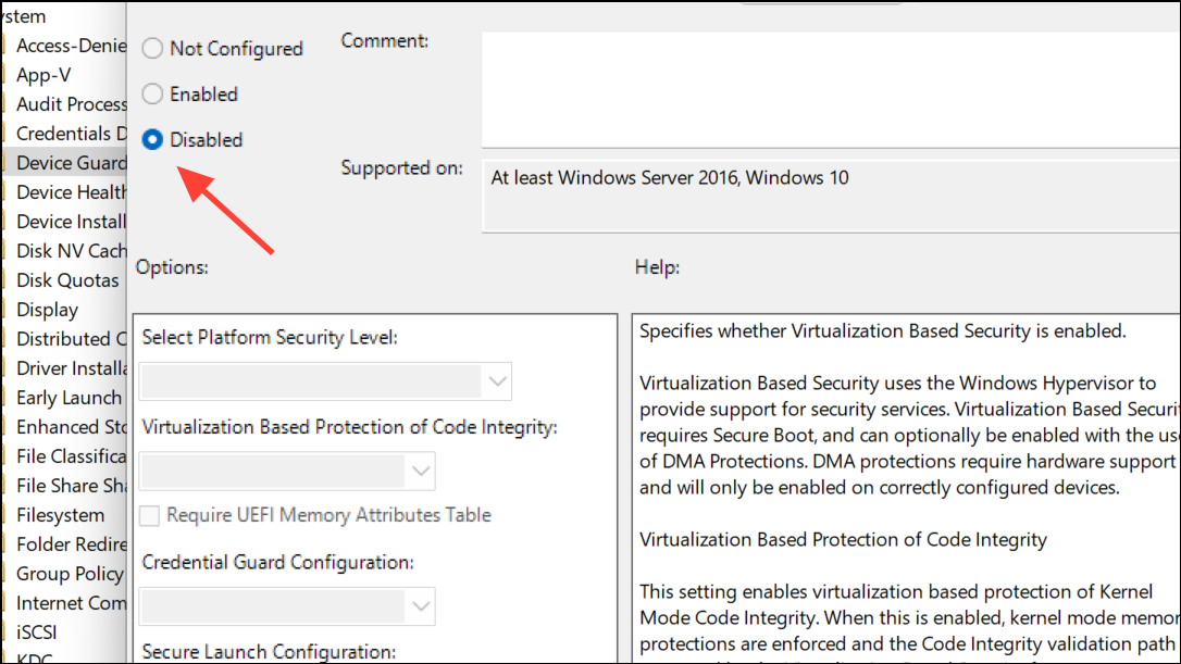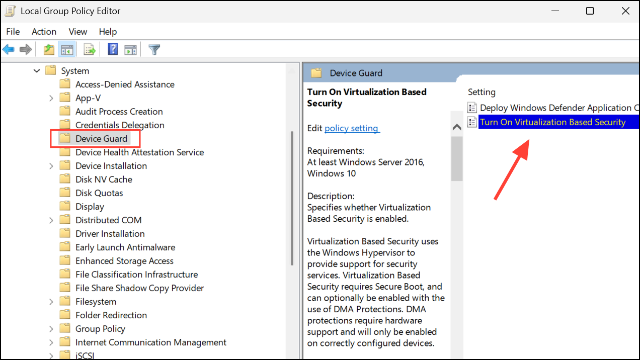 Step 2: Navigate to Computer Configuration > Administrative Templates > System > Device Guard > Turn On Virtualization Based Security.