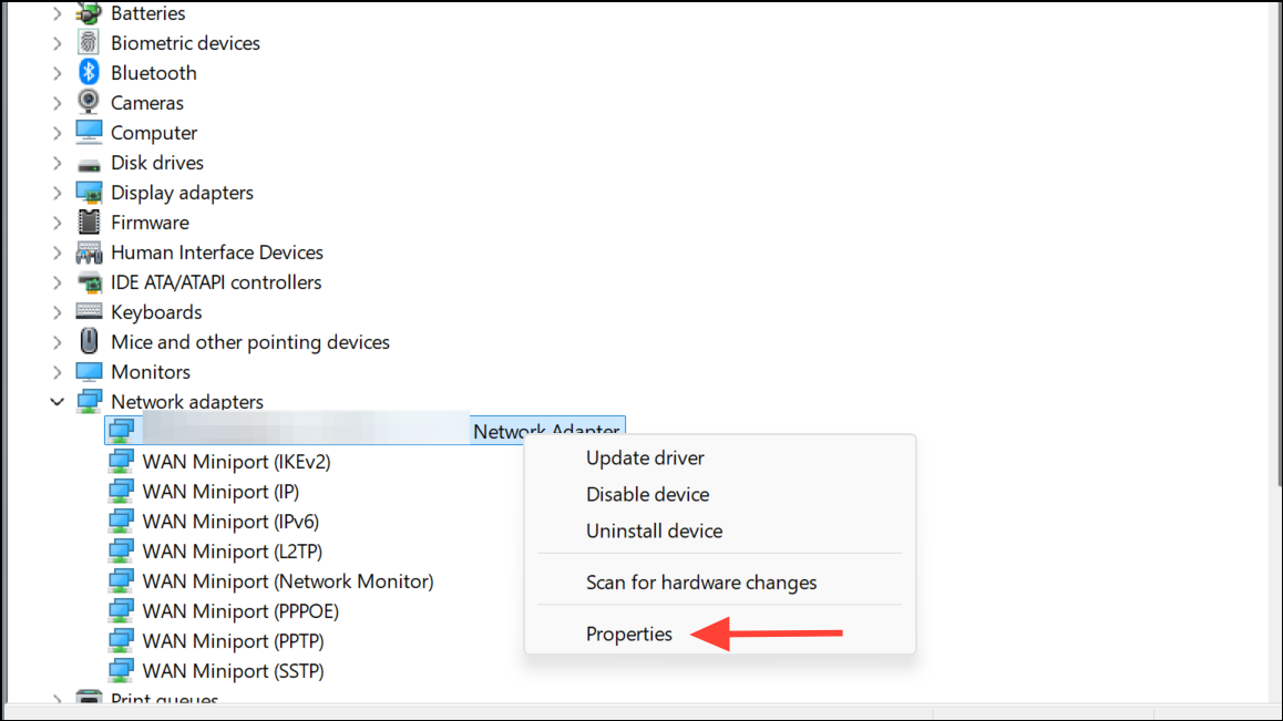 Step 1: In Device Manager, right-click your Ethernet adapter, select Properties.