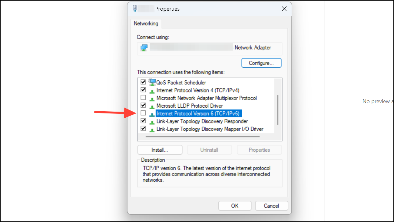 Step 2: Right-click your Ethernet connection, select Properties, and uncheck Internet Protocol Version 6 (TCP/IPv6). Click OK and restart your PC. Disabling IPv6 can resolve conflicts that interfere with DHCP or network identification.