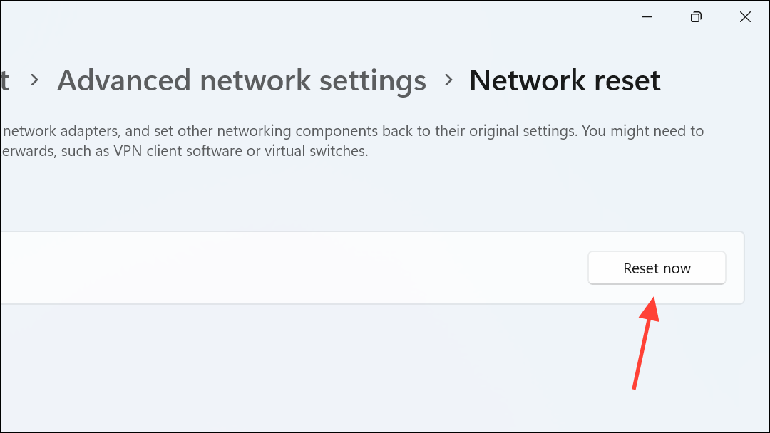 Step 2: Click Reset now and confirm. This process removes all network adapters and resets all networking components to default. Your PC will restart, and you may need to reinstall VPN clients or reconfigure custom network settings afterwards.