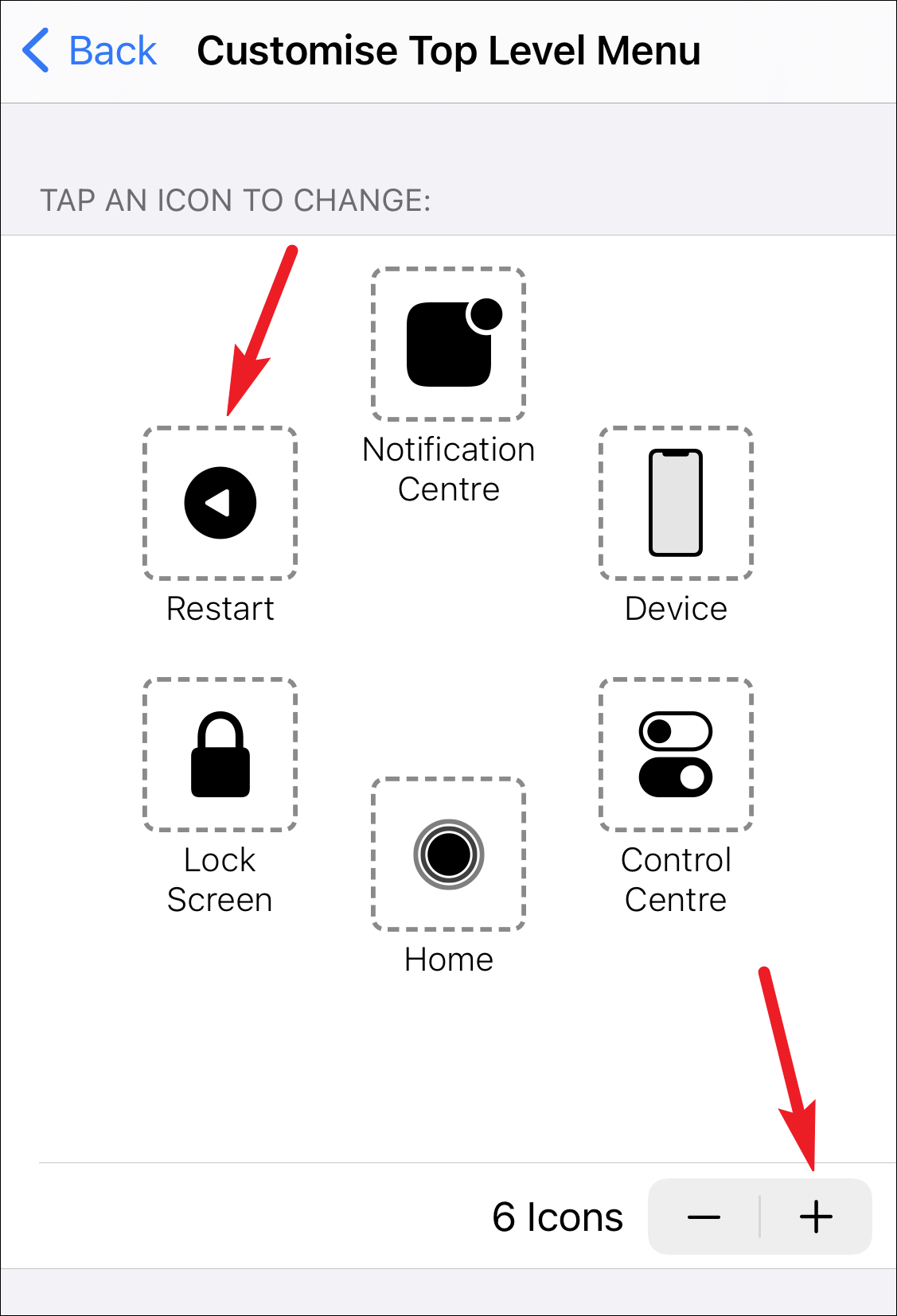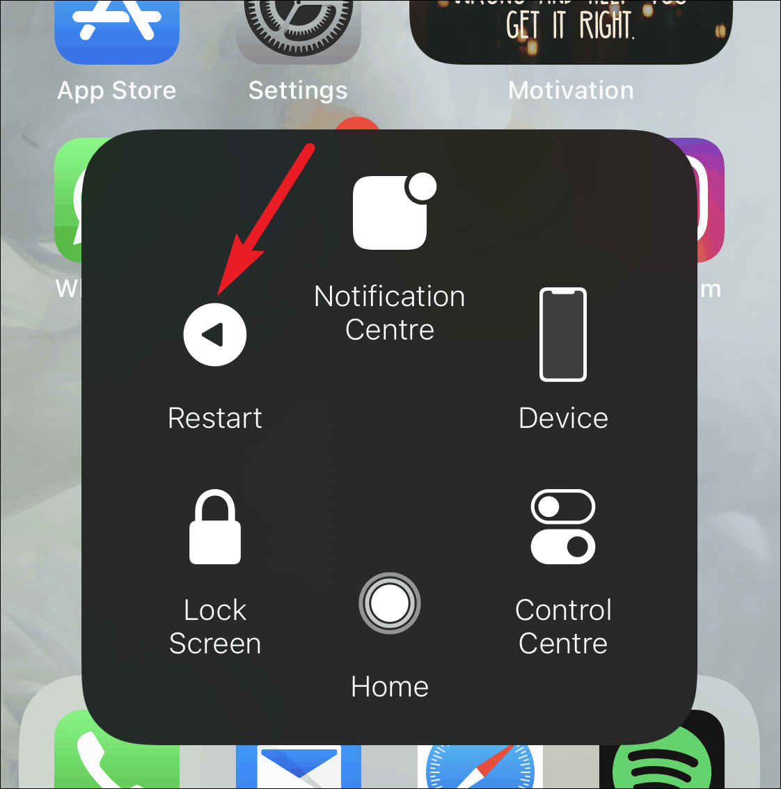 There are two ways you can use AssistiveTouch to restart your iPhone. You can either add it to the menu or use one of the Custom Actions.