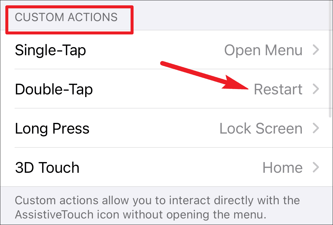 To configure a Custom action to restart your phone, tap on one of the Custom actions (Double-Tap, Long Press, or 3D Touch) and select Restart from the list of options.