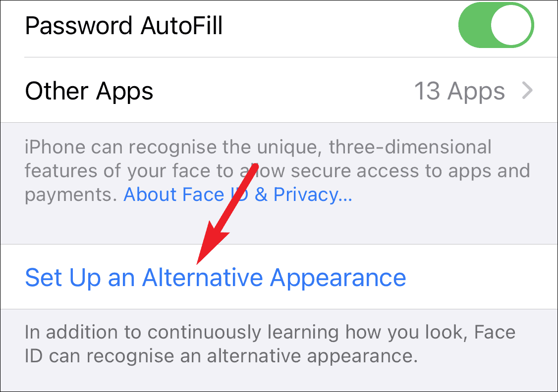 If restarting your phone didn’t help, maybe setting up an alternate appearance will. Generally, alternate appearance is useful for circumstances when you’ve changed your appearance drastically, and Face ID doesn’t recognize you any longer. But in this case, setting up an alternate appearance can help fix the issue.