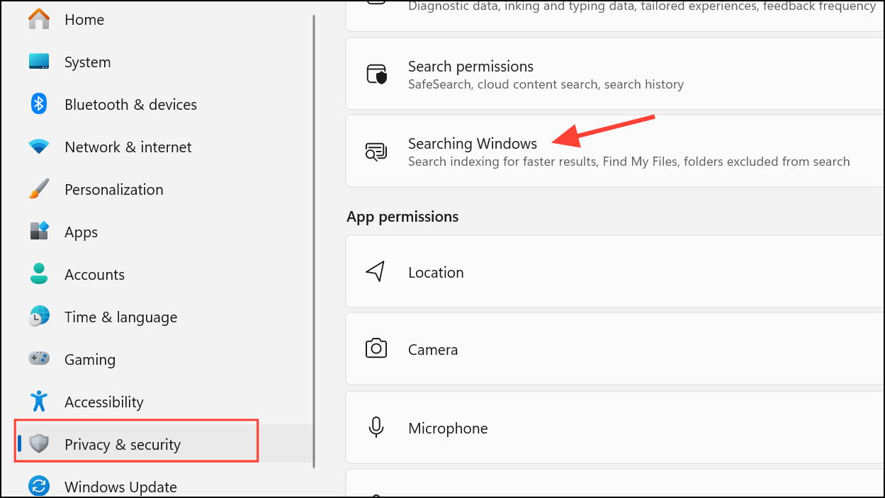 Step 1: Open Settings and go to Privacy & security, then select Searching Windows.