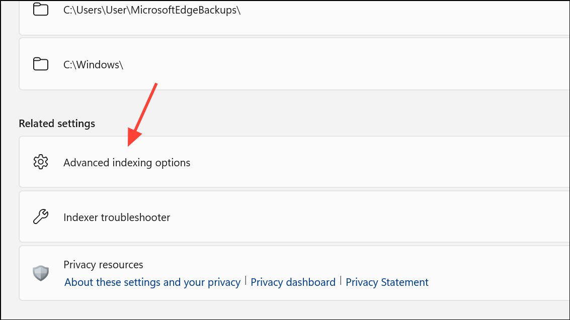 Step 2: Scroll down and click Advanced Indexing Options.