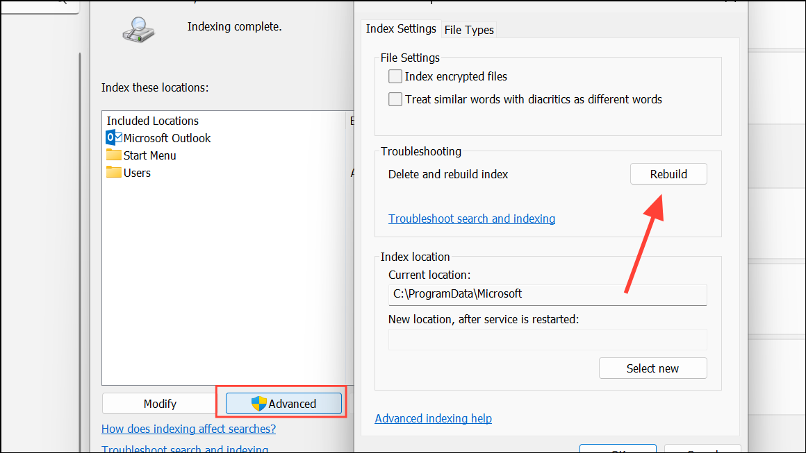 Step 4: In the same window, select Advanced and click Rebuild under Troubleshooting. Confirm to delete and rebuild the index. The process runs in the background and may take time, especially if you have many files, but it resolves database corruption and clears stuck indexing jobs.
