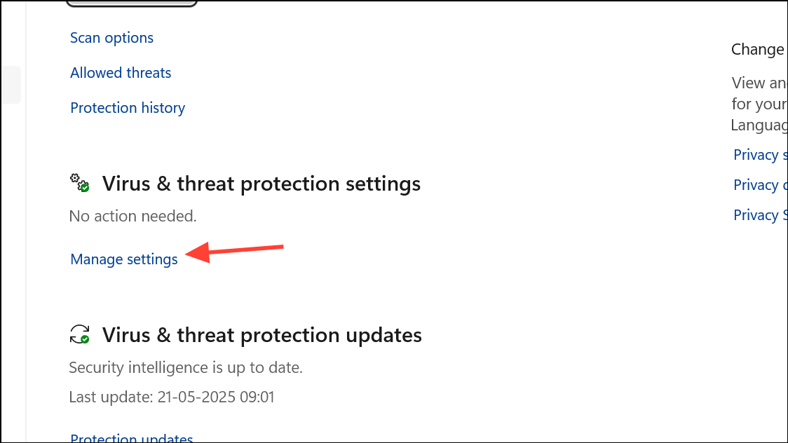 Step 2: Go to Virus & threat protection and select Manage settings under "Virus & threat protection settings".
