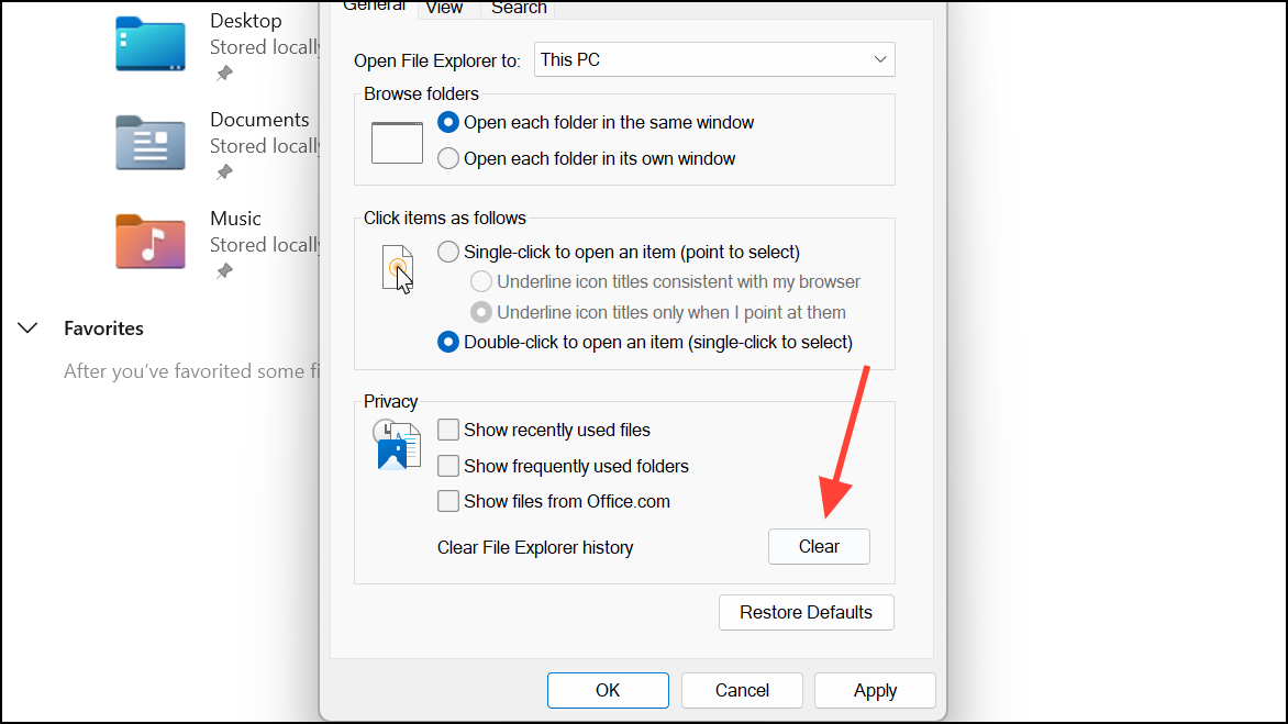 Step 3: In the same dialog, under Privacy, click Clear to remove File Explorer history, which can accumulate and slow down performance.