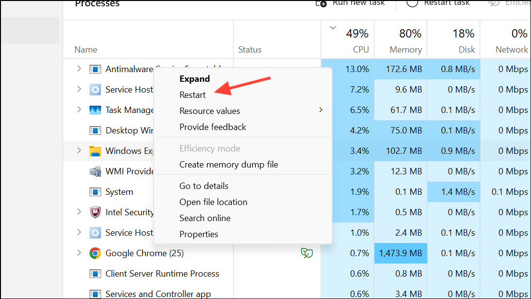 Step 2: Find Windows Explorer in the list, right-click it, and select Restart. This will briefly close and reopen all File Explorer windows.