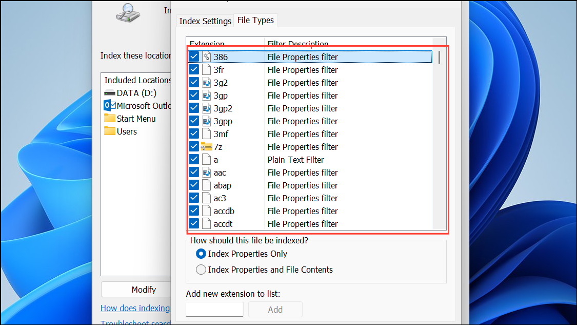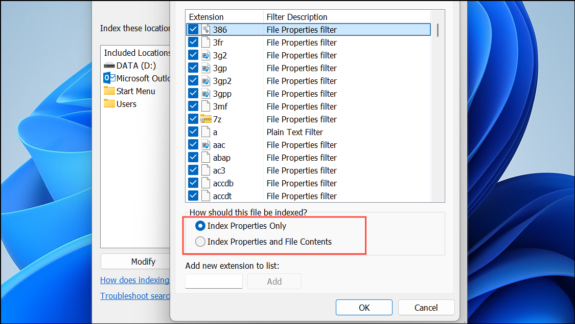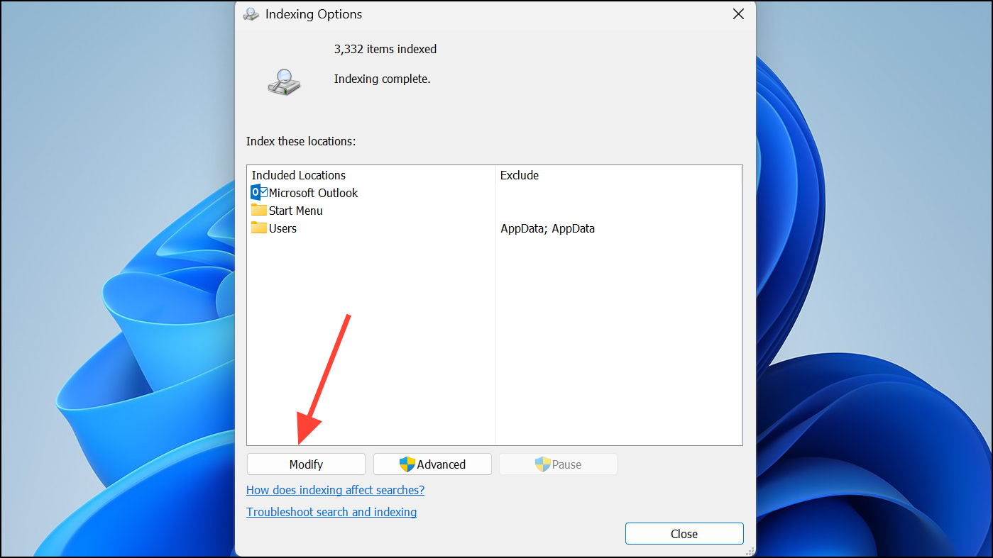 Step 3: In the Indexing Options window, confirm that the folders you want to search are included. Click Modify to add or remove locations as needed.