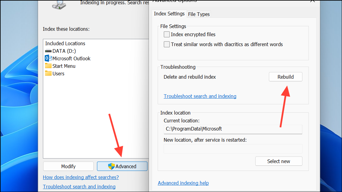 Step 4: Click Advanced, then under the Troubleshooting section, select Rebuild. This will erase and recreate the index. The process may take several hours, especially on systems with many files. Avoid heavy use of the computer during this period to speed up the process.