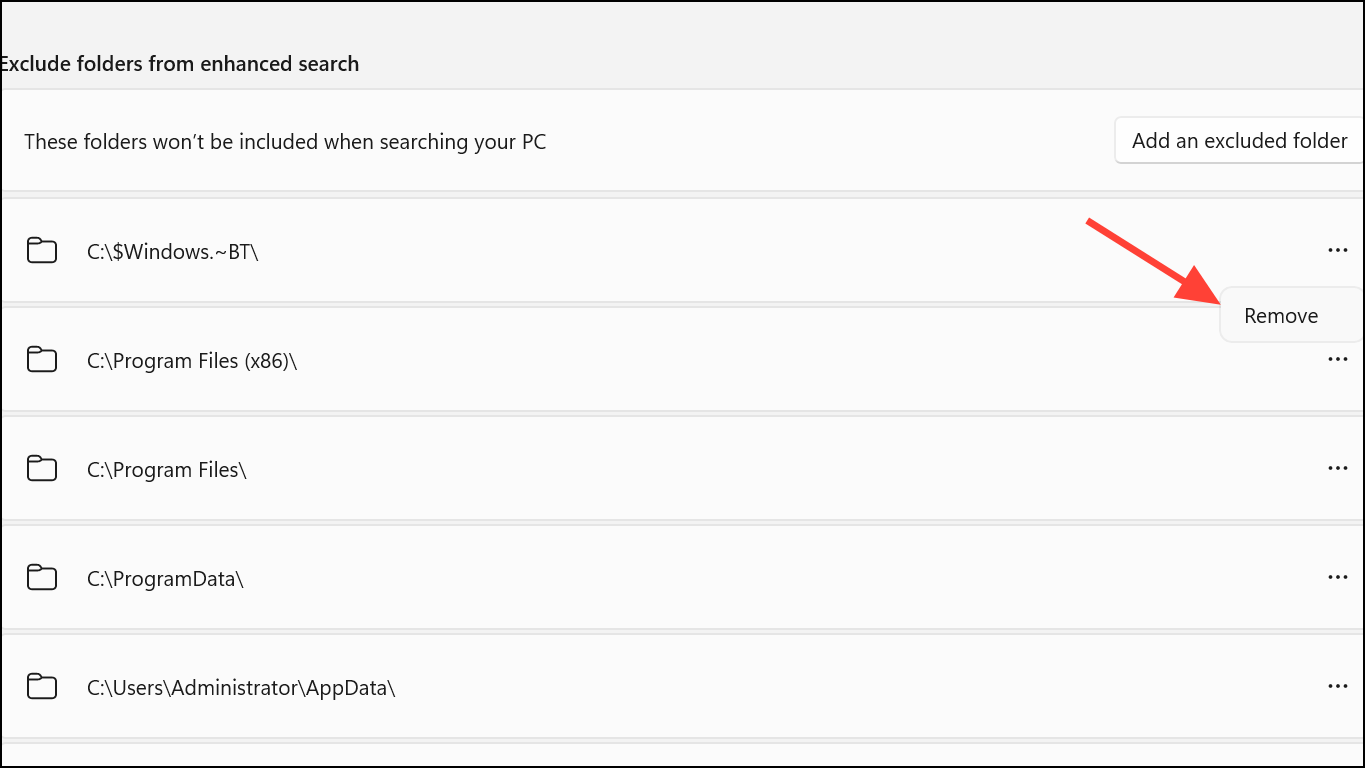 Step 4: Review the "Excluded Folders" section. Remove any folders you want included in search results by clicking the folder and selecting Remove Excluded Folder.